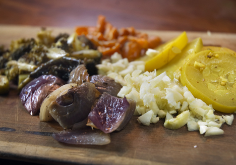 Rough chop the veggies.