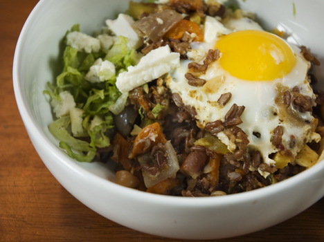I think of this dish as my version of the garbage plate, albeit one with a slightly lower fat content perhaps! A marvelous hodgepodge pile of my fridge excavations crowned with a golden, runny egg, this dish in some incarnation is my day-to-day sustenance. Bhutanese Red rice, the base grain of this particular version, has a wonderfully nutty flavor and chewy texture– but it is the color that really impresses. Tossed with a vibrant veggies, this colorful meal is akin to stir fry/fried rice but the addition of the egg reminds me more of breakfast hash.