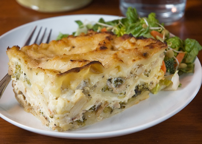 5. Ladle a small amount of the white sauce into a 13×9 casserole dish. Line lasagna noodles on the bottom over the sauce. Add 1/3 of the veggie/meat mixture over the noodles, spread 1/2 of the cheese mixture, and ladle 1 cup of sauce. Repeat until all ingredients are used (total of 3 layers). Cover with foil and bake for 30 minutes, then remove foil and bake for another 20-30 (until lightly browned and cheese is bubbly). Let the lasagna sit for about 10 minutes to cool before serving.
