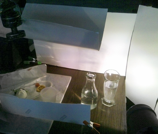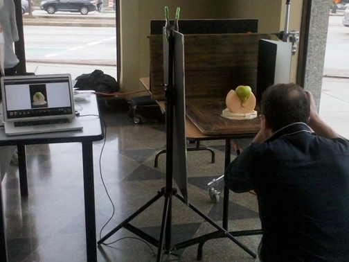 Here photographer Viktor Budnik and stylist Karen Hazarian Tully work on an image of mozzarella lit with a single light reflected off white board and through several glass vases filled with water.