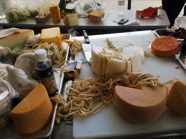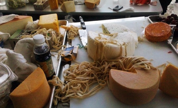 Below, photographer Jeffrey Kauck shoots and image of pasta, cheese and a pear styled by Nir Adar. Jeff is using natural light from the window on the right.