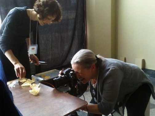 The third team was composed of photographer Deborah Jones and Lisa Golden Schroeder. Here they are working with stacks of parmesan chips, again lit naturally from the window.