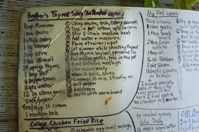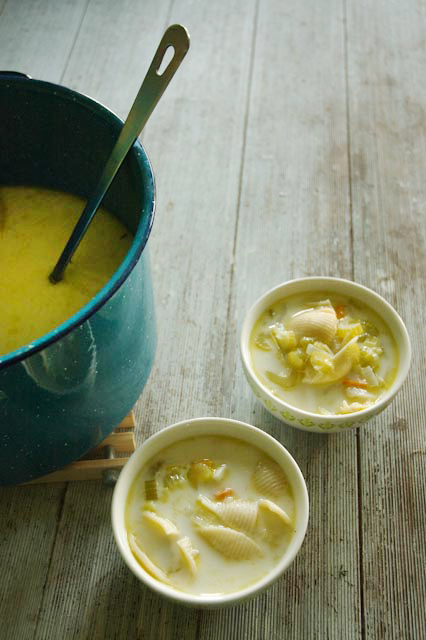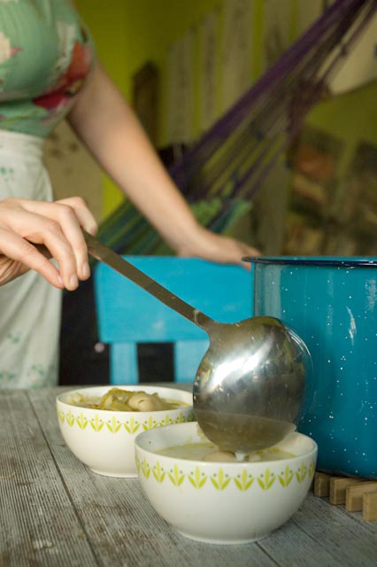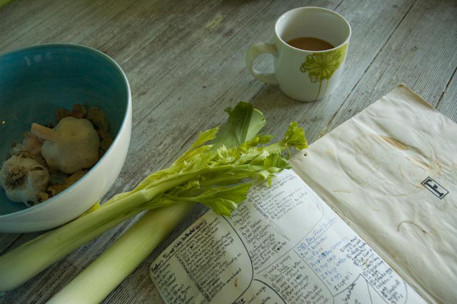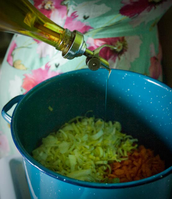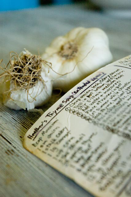 Heather, a self-proclaimed descendant of “pot-pie-people,” explained that this soup evolved from her foray into learning to be a grown-up. The recipe evolved from one she found in a French cookbook checked out of her college library, after moving into her first apartment. The book was a bold choice for a beginning cook and this recipe was initially chosen as the modest option out of many with extravagant ingredients and techniques. Simplified by skipping the work of puréeing the final product, this ‘remixed’ version is far from the fussy original.