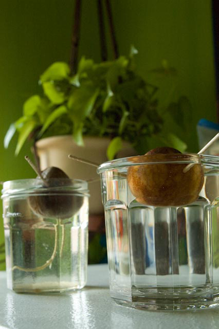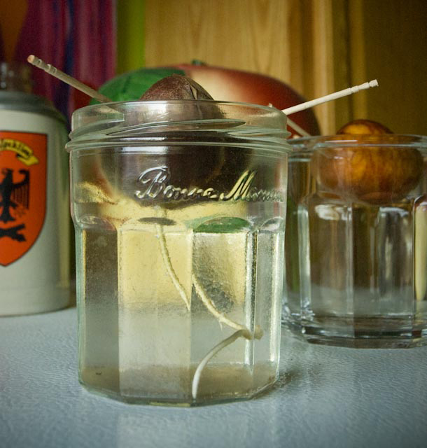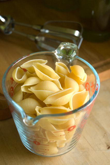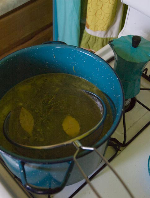 - Toss thyme, bay leaf, peppercorns [in the strainer].