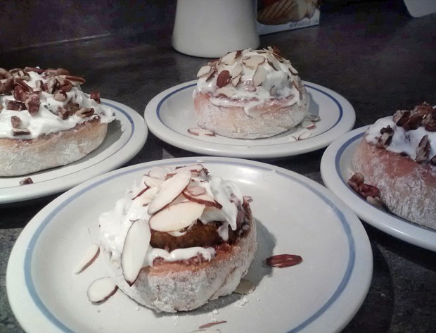 Separately, add more flour and baking powder to the now risen dough. I kneaded it with my hands, not the mixer, despite it covering my hands as it is very very very sticky by this point. Next lay it out on a surface that is very floured and roll out with a rolling-pin. Keep a little cup of flour next to you so you can re-flour your hands and the roller constantly. Next, spread melted butter with a spoon, spreading it around with the back of the spoon, on the now flattened dough. Pour the awesome cinnamon roll filling on the dough. The more square you make the dough when you roll it out, the less likely you will have two oblong rolls when you cut. Once it is rolled up (be careful about the dough sticking underneath!! Pull lightly!!) use a large non-serrated knife to cut it into 12 rolls. They will flatten: when you pick them up and put them on a buttered cooking pan, reshape them circular. Then cover AGAIN and let rise for 45 minutes. Bake and then put some awesome stuff on top like cream cheese frosting and nuts.