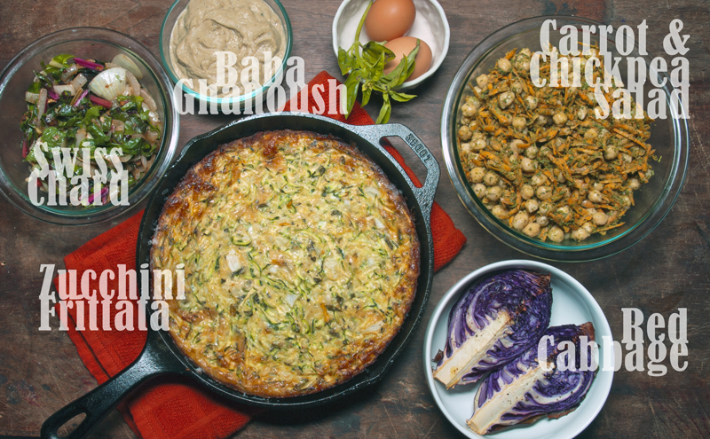 I’ve been relying on frittatas nearly every week to use up my eggs; this week I incorporated the zucchini, basil, some of the garlic and onion. Michael Chiarello’s recipe is very close to this version.