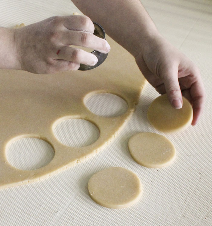 - Either by hand or with a mixer, combine the oil, eggs, vanilla, water, sugar, baking powder and flour and knead until a soft dough forms. Roll the dough out into a very thin layer. Dip the rim of a 3 or 4 inch cup or glass in flour and use like a cookie cutter to cut the circles. Re-roll the scraps of dough and reuse.