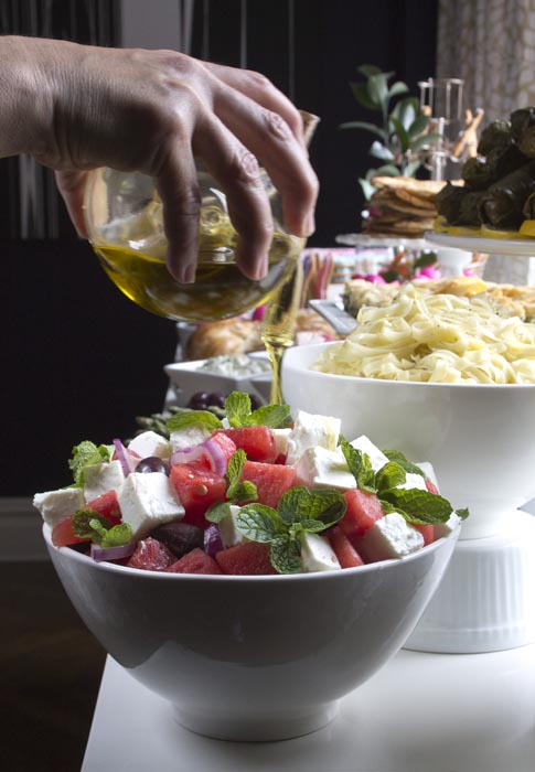 Whisk the vinegar, salt+pepper, and olive oil together. Toss with the watermelon, feta, olives, onion, and mint.