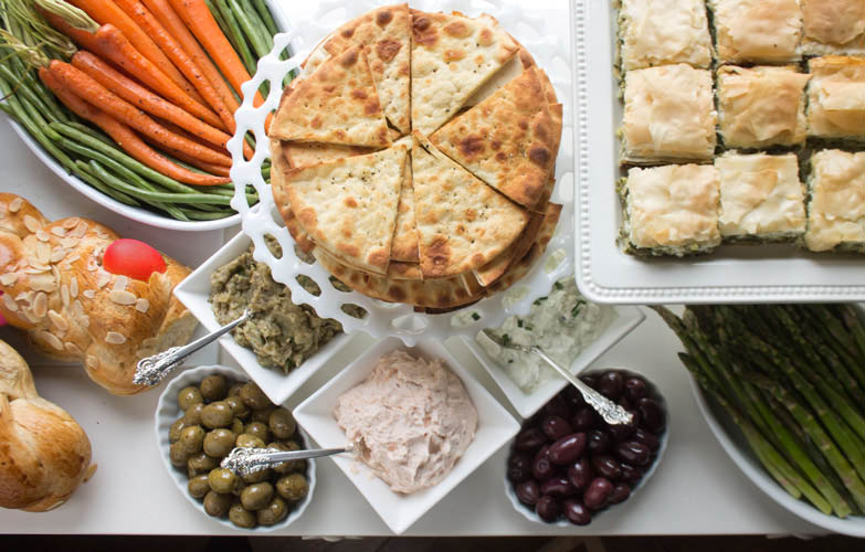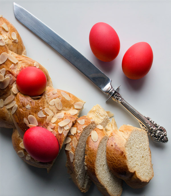 Tsoureki, a sweet bread similar to brioche, is traditionally topped with red-dyed eggs for Easter.